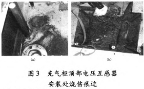 查看35kV垣潔線56號線路電壓互感器上端柜頂,發現柜頂插拔處燒損,斷路器室壓力開釋設備動作。將壓力開釋通道翻開后,發現本柜斷路器室壓力開釋盤動作,壓力開釋通道有許多燃弧噴出的落塵。翻開斷路器室入孔后,發現氣室內有燃弧痕跡。氣室內其它絕緣件未受損,銅排和充氣柜柜體外表有落塵無燒傷痕跡,如圖3所示。
